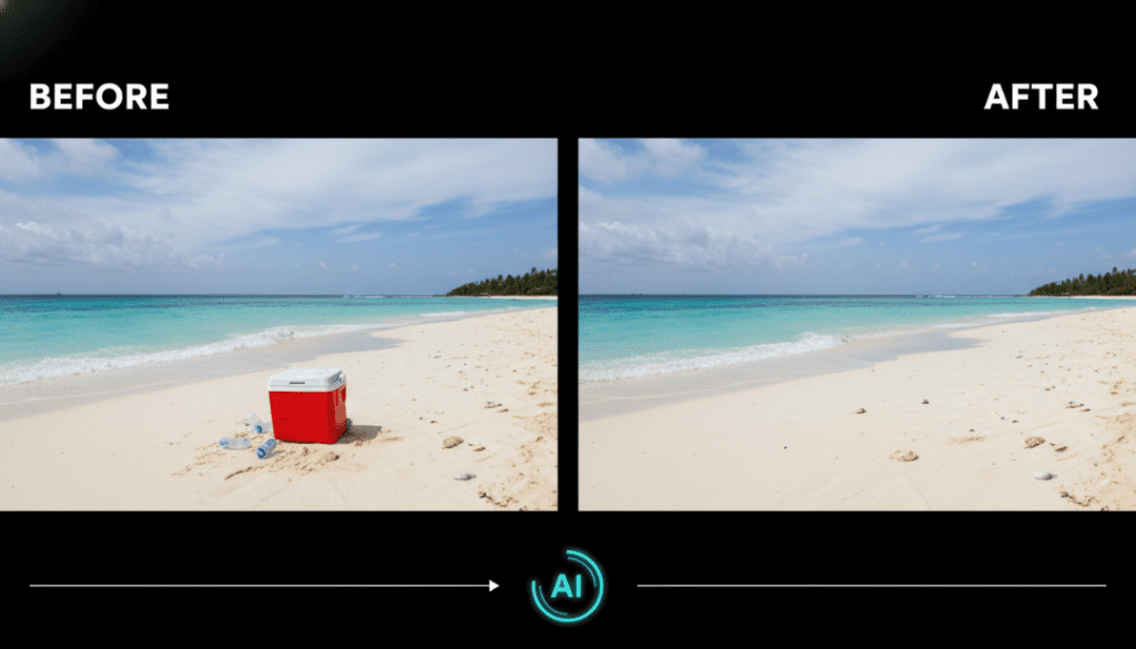 A ferramenta entende o contexto da imagem e substitui a área removida com pixels coerentes — como se o objeto nunca tivesse existido.